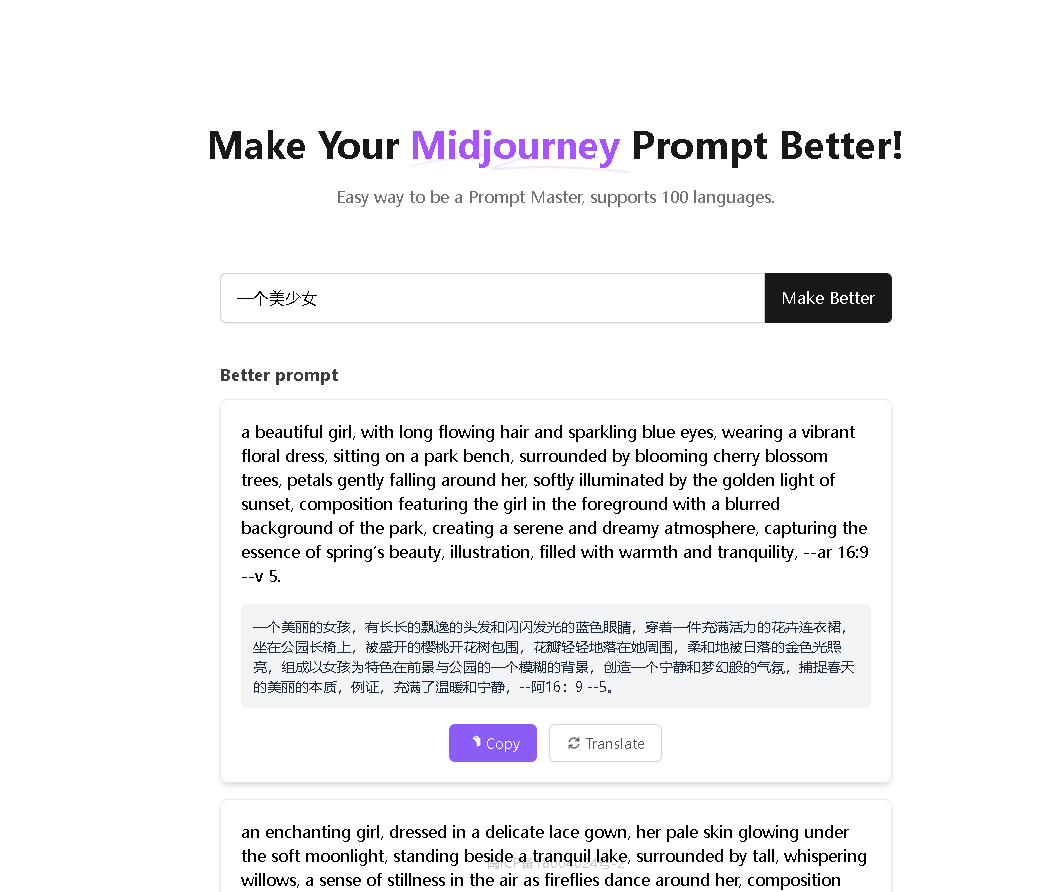 没有复杂的界面,使用方法也很简单:只需要填写你想要的几个描述词就能给你生成不同风格的关键词!