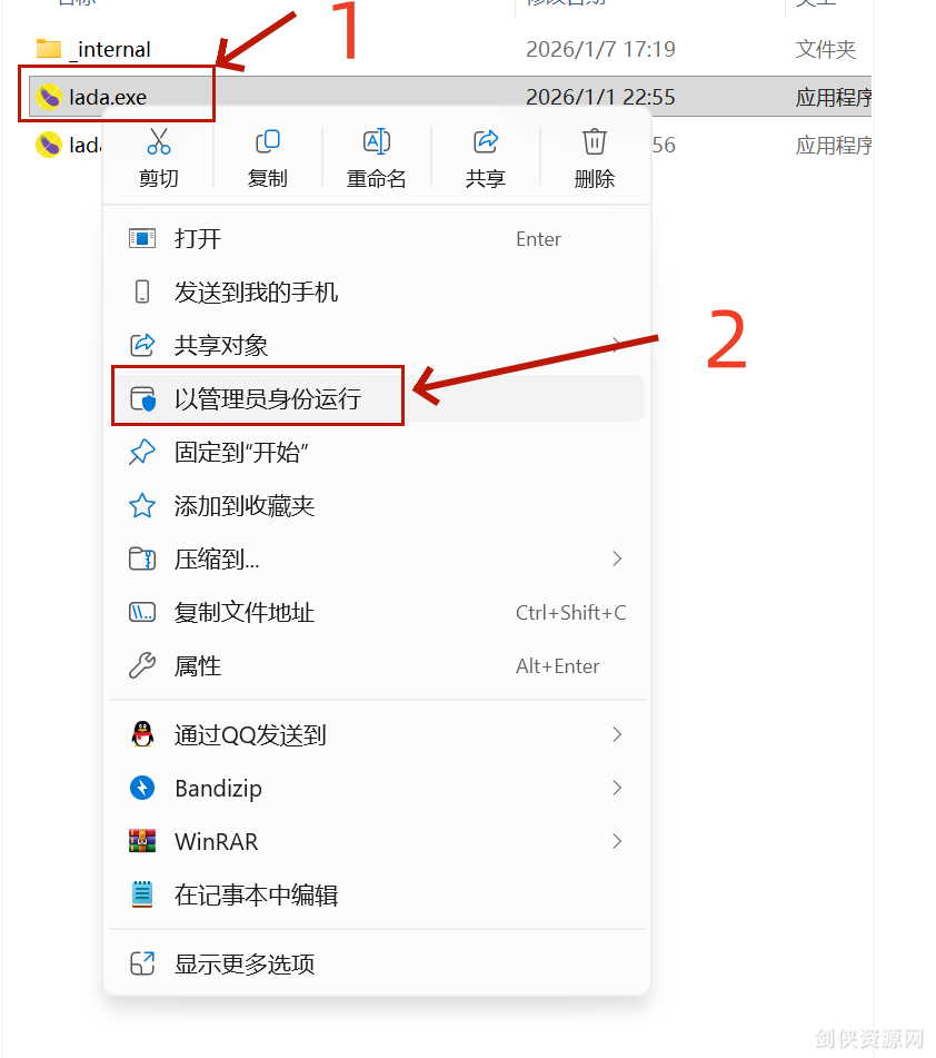 注意事项:工具解压目录不能包含中文,不然可能会报错,启用方法右键目录下的lada.exe以管理员身份运行即可正常启动